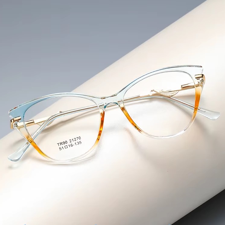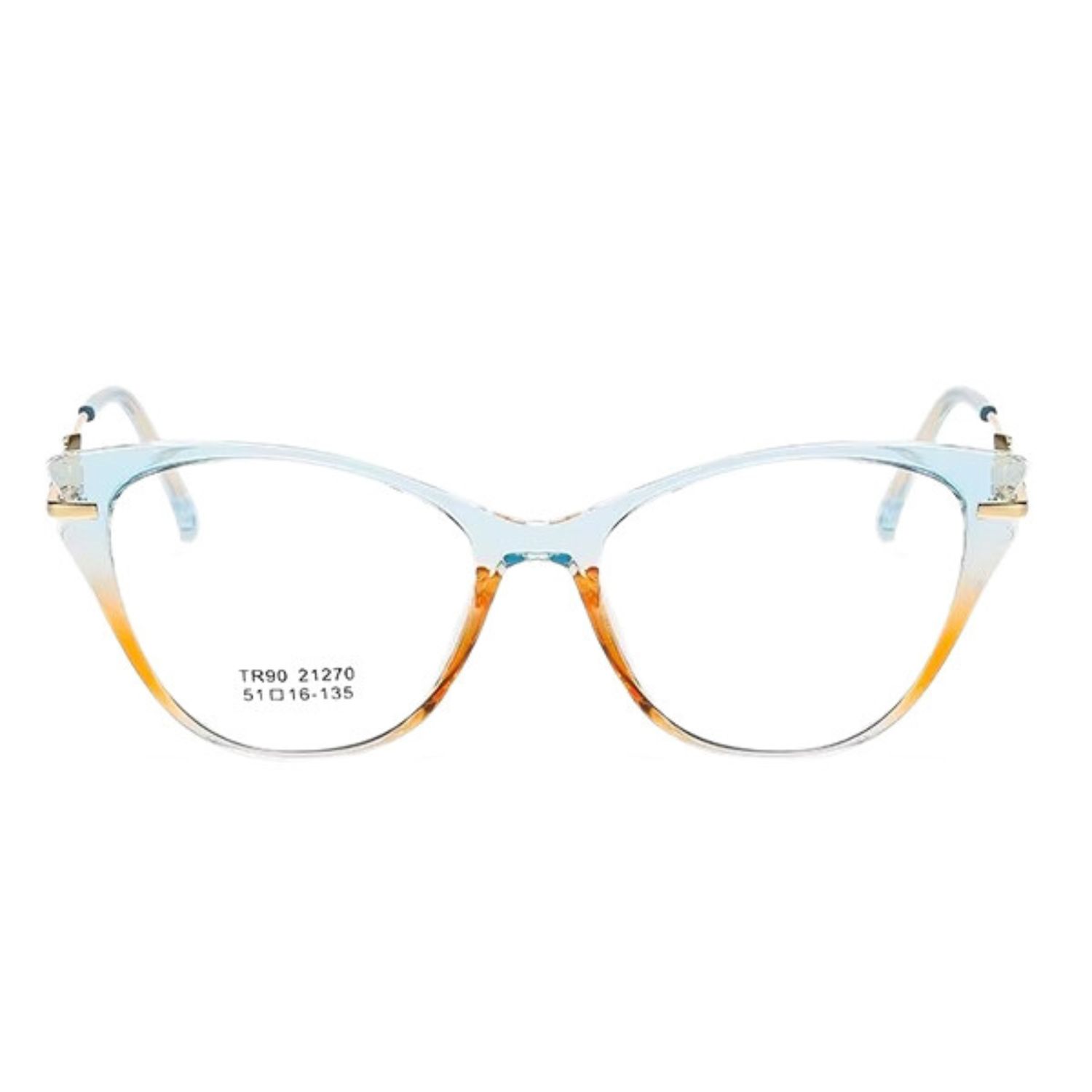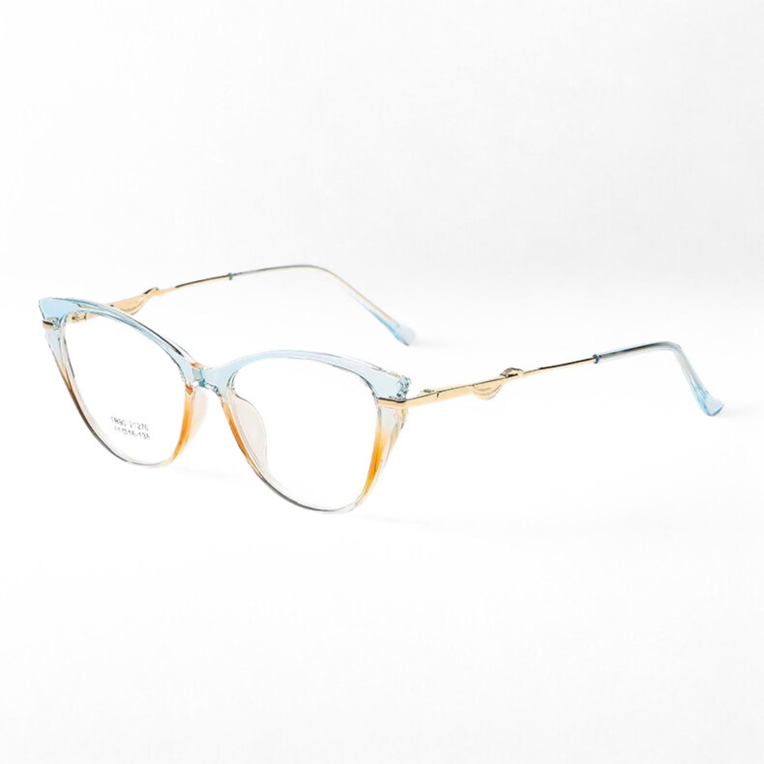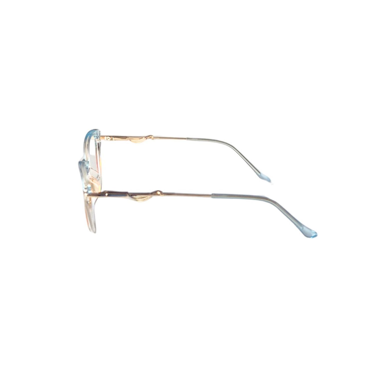 Celeste: Armazón celestre transparente combinado con ocre transparente y patillas doradas