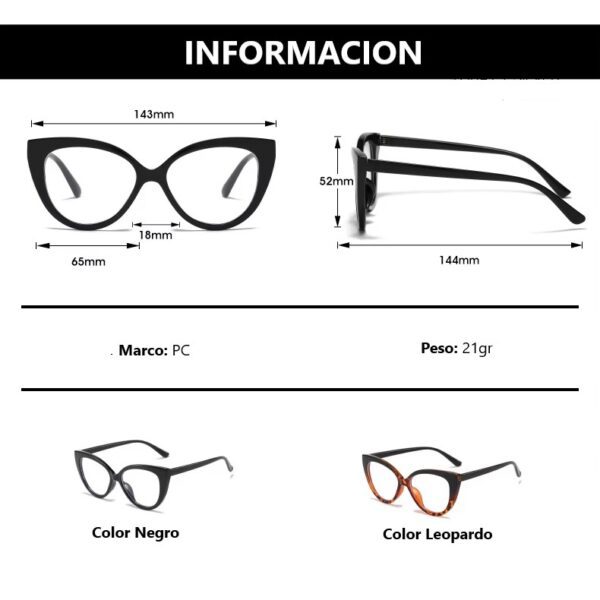 Armazón fabricado en policarbonato de alta calidad, un material liviano, cómodo y duradero, con cristales anti luz azul, sofisticado, moderno y atemporal. Apto para lentes recetados.  Diseño ojo de gato vintage, ideal para todo tipo de rostros.  Sus bisagras flexibles aseguran mayor durabilidad.