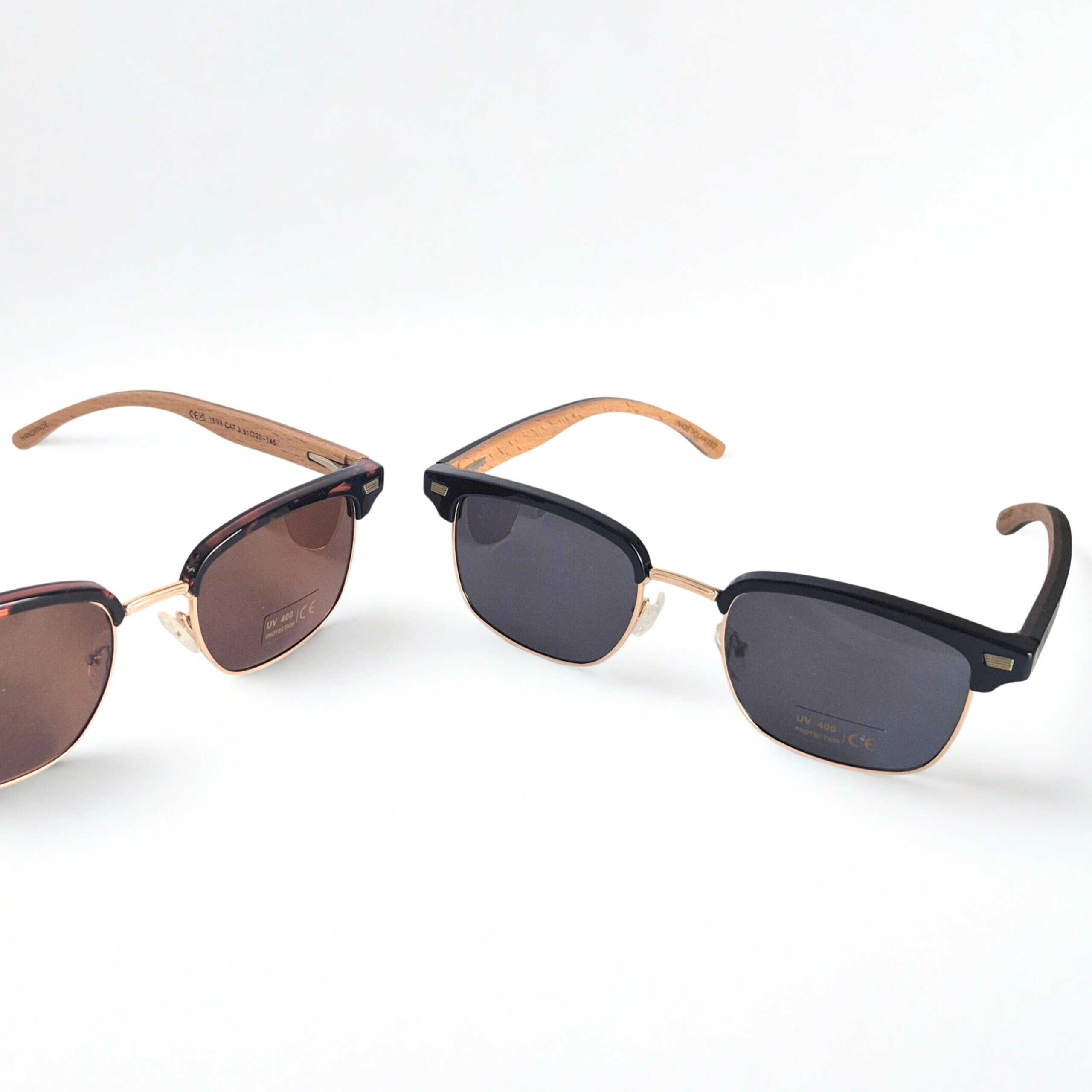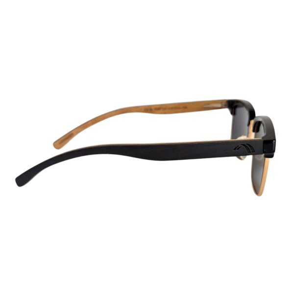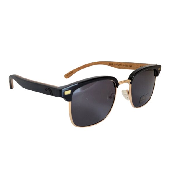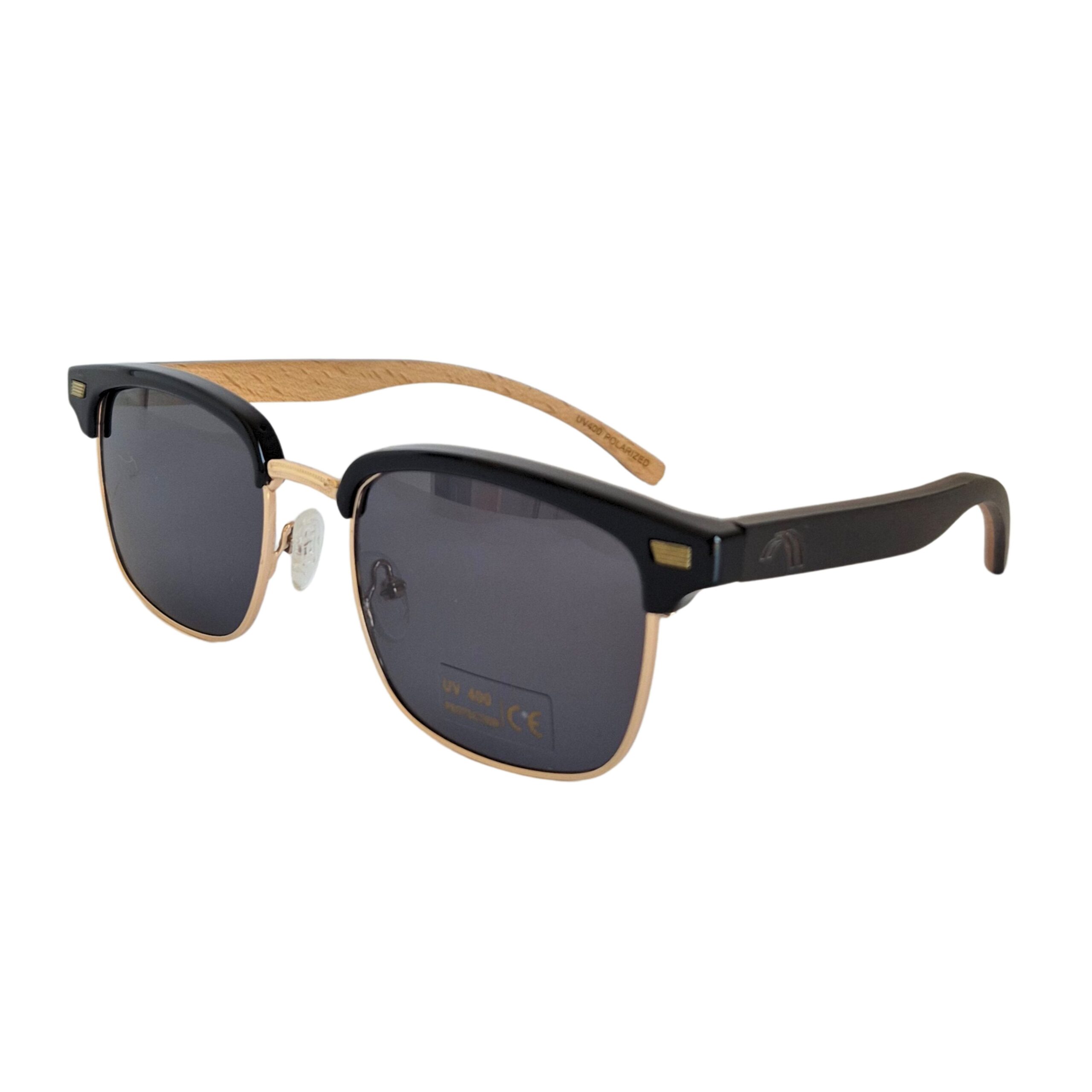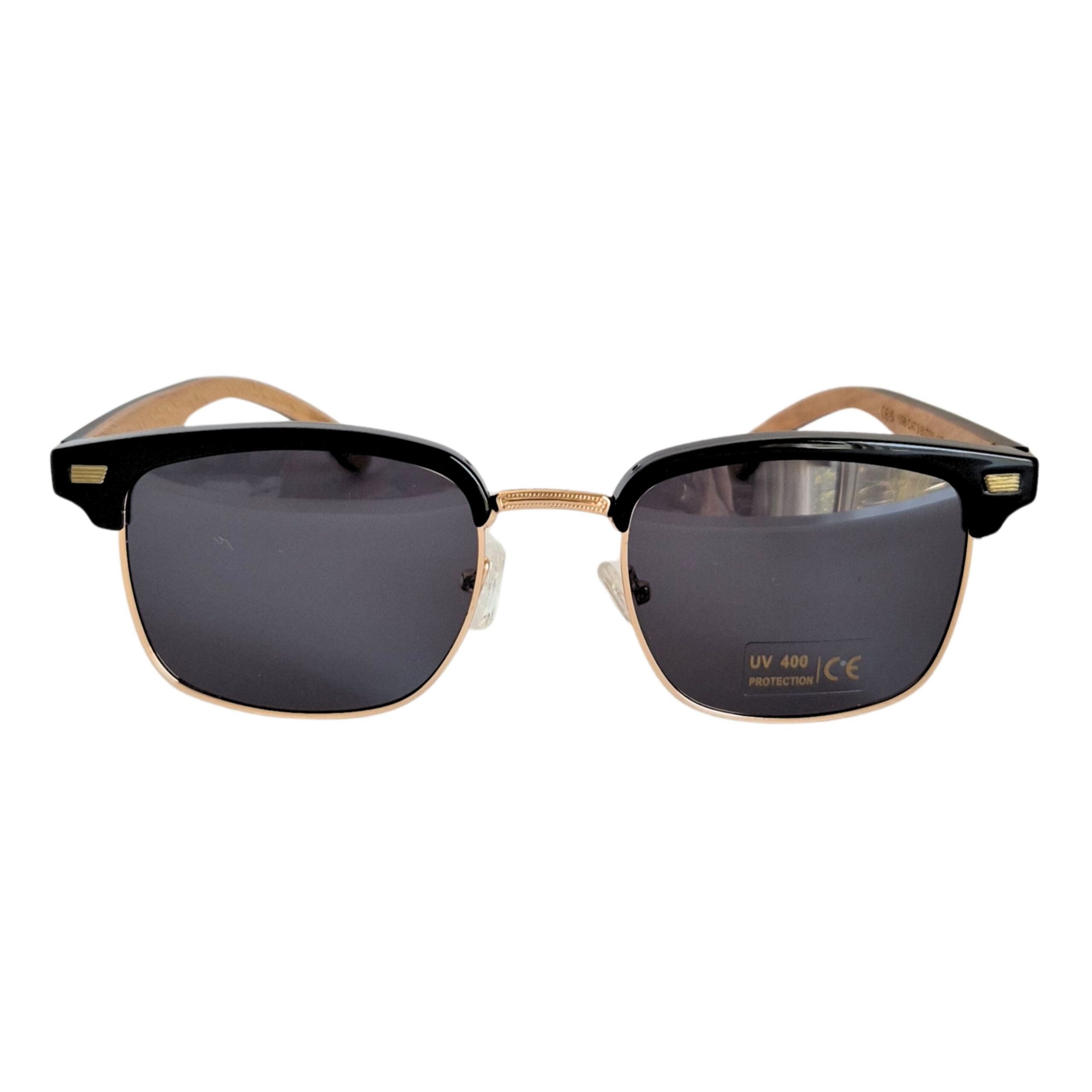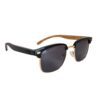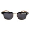 Negro: Marco metálico dorado con borde superior negro, patillas de madera bambú negras y cristales tonalizados negro