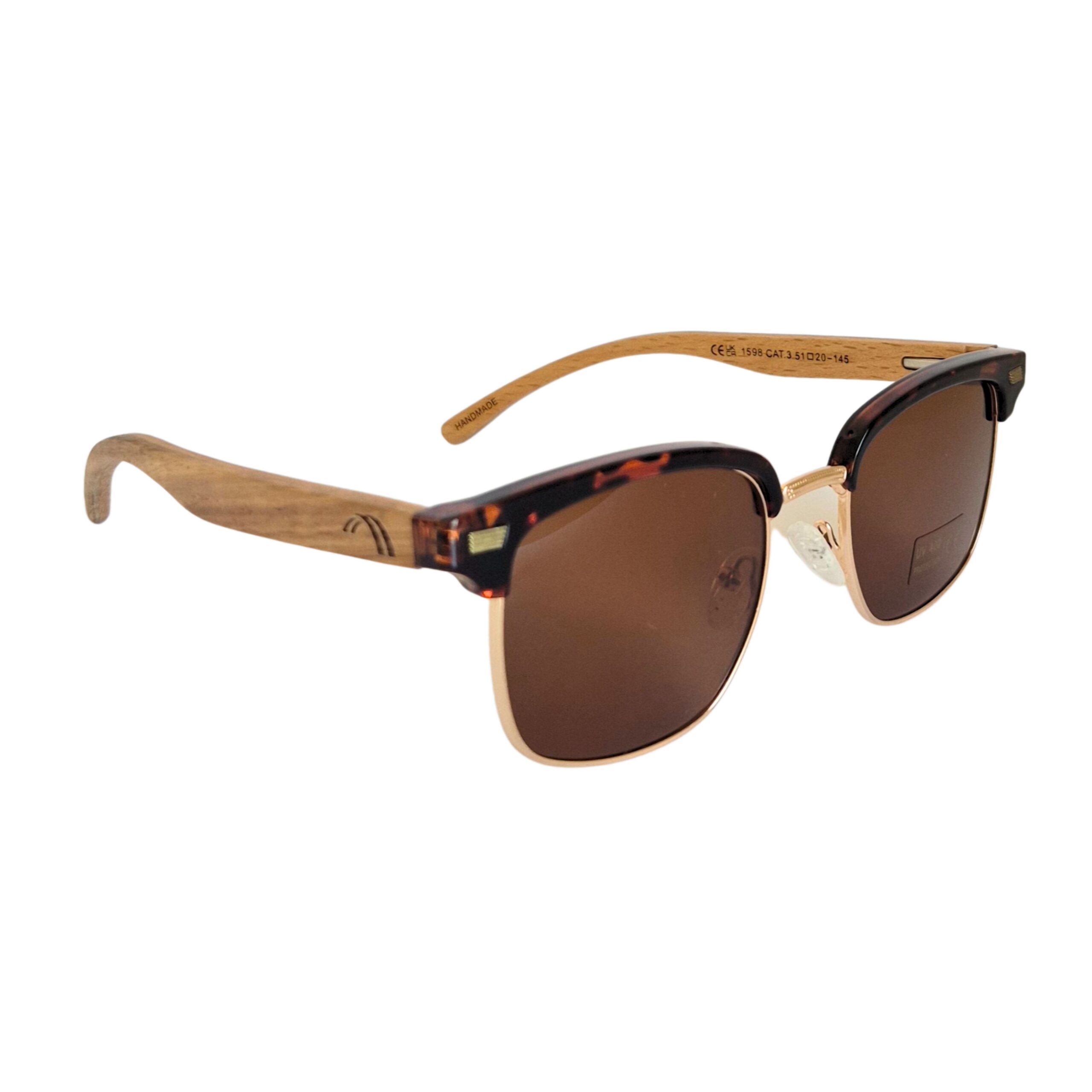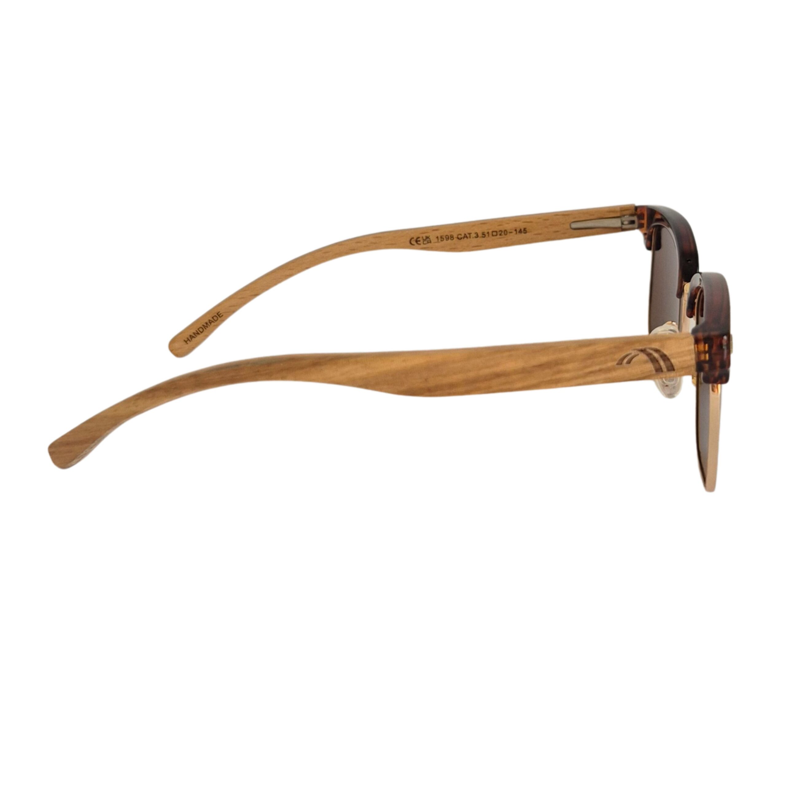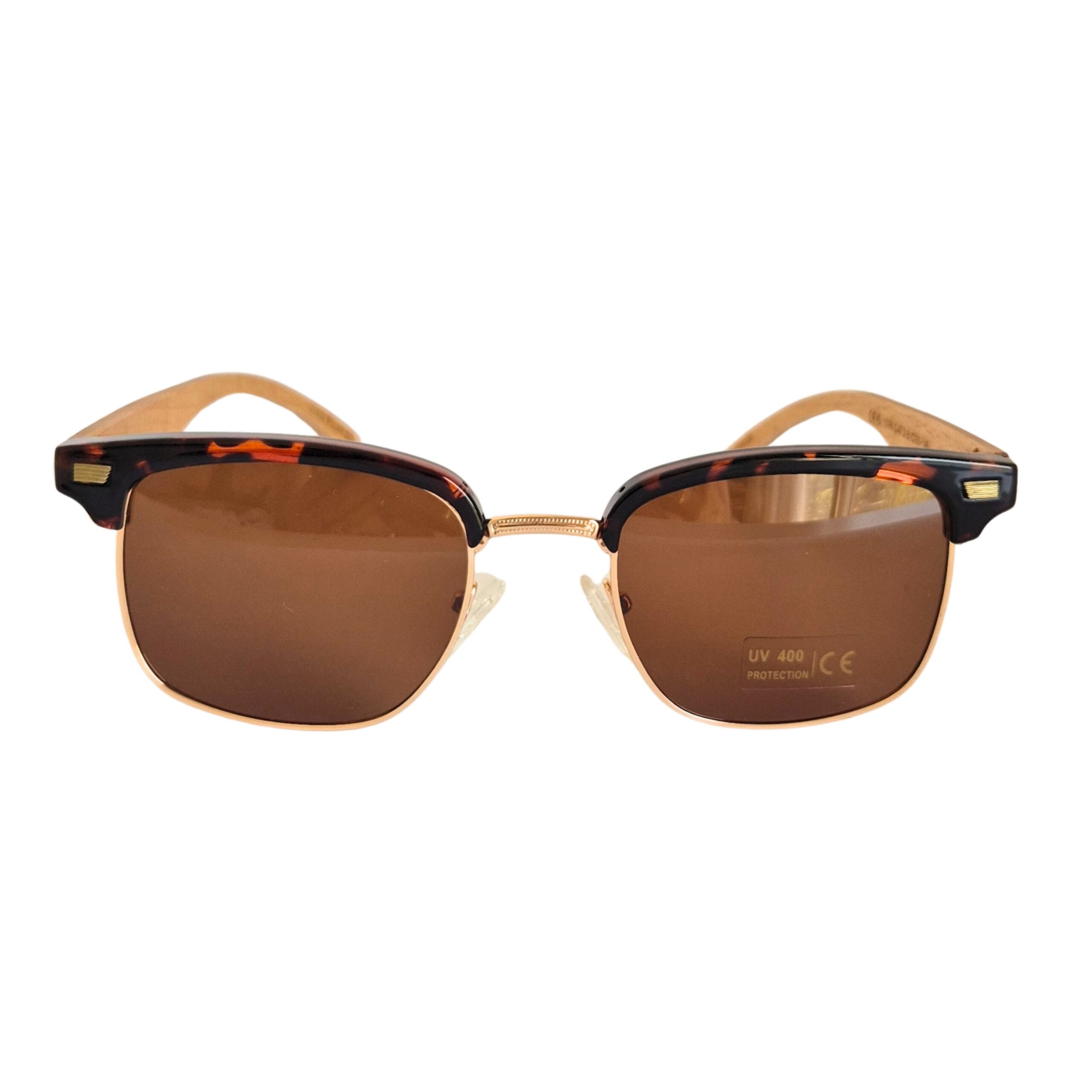 Print: Marco metálico dorado con borde superior print, patillas de madera bambú marrón y cristales tonalizados marrones
