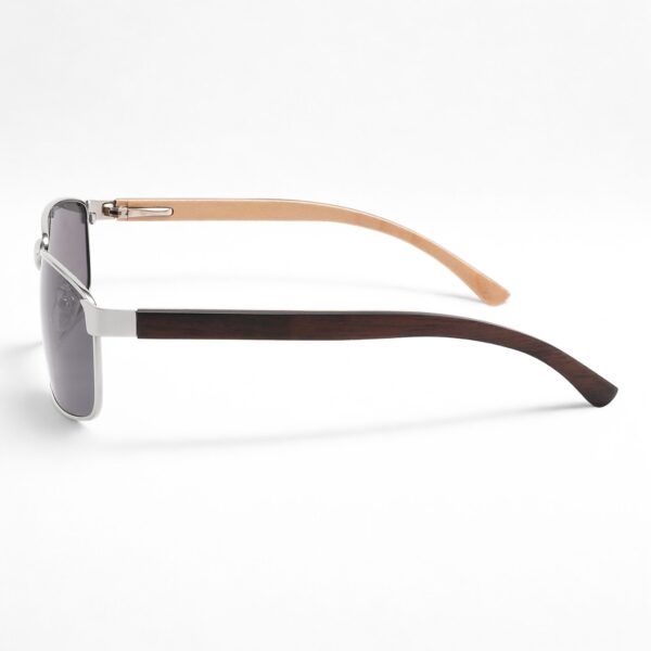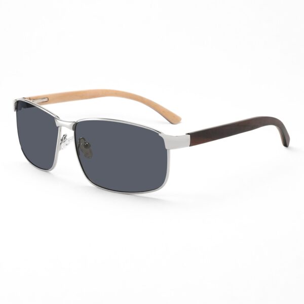 Negro-Plateado: Marco metálico negro con bisagras plateadas, patillas de madera bambú negras y cristales tonalizados negros