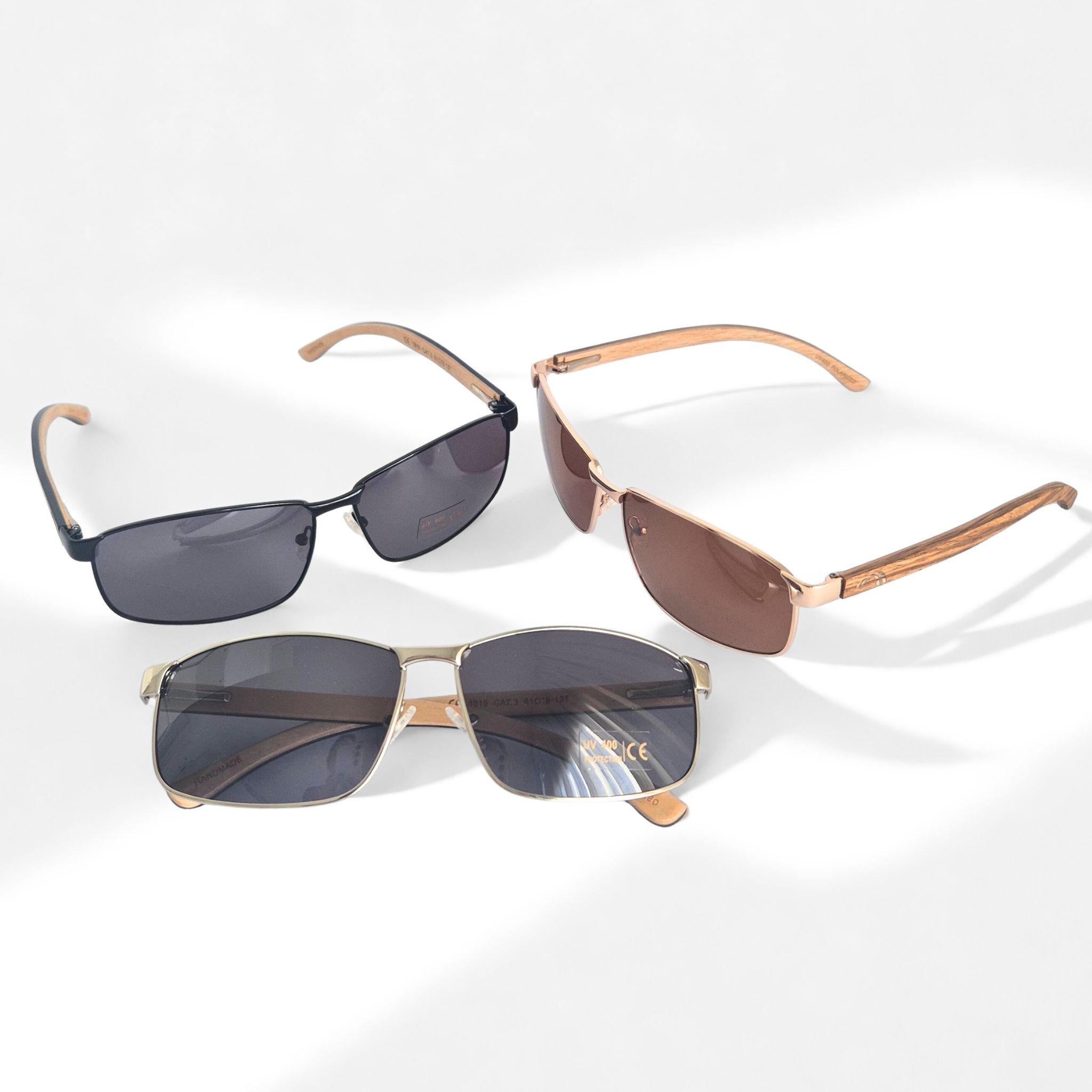 Lentes de sol rectangulares unisex modernos ideales para todo tipo de rostros. Fabricado en metal de alta calidad con patillas de bambú y cristales TAC polarizados livianos resistentes al impacto de golpes, con protección UV 400.