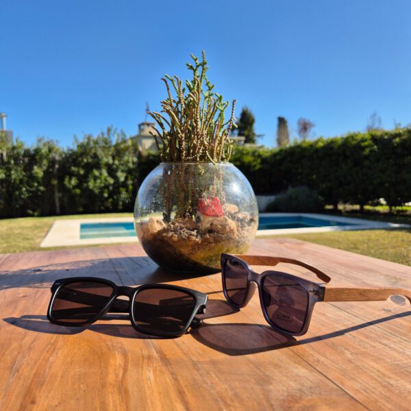 Lentes de sol rectangulares unisex modernos ideales para todo tipo de rostros. Con material de acetato, patillas de madera bambú y cristales livianos resistentes al impacto de golpes, con protección UV 400.