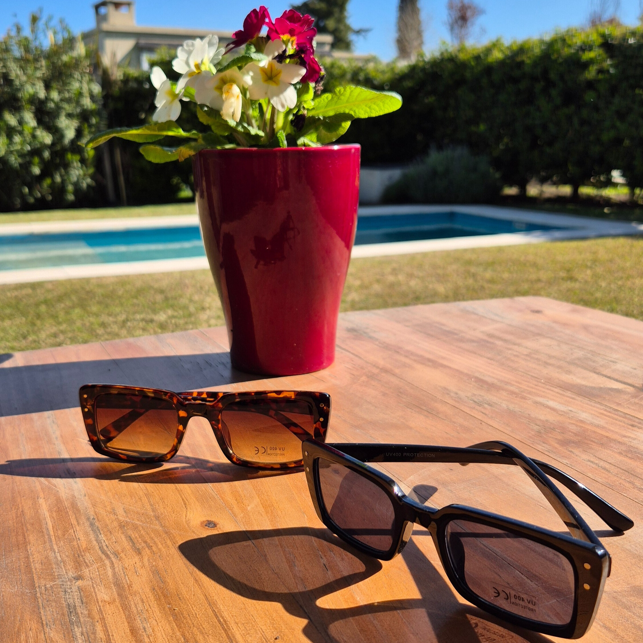 Lentes de sol rectangulares de diseño simple y atemporal, ideales para todo tipo de rostros. Con material de policarbonato y cristales livianos resistentes al impacto de golpes con protección UV 400.